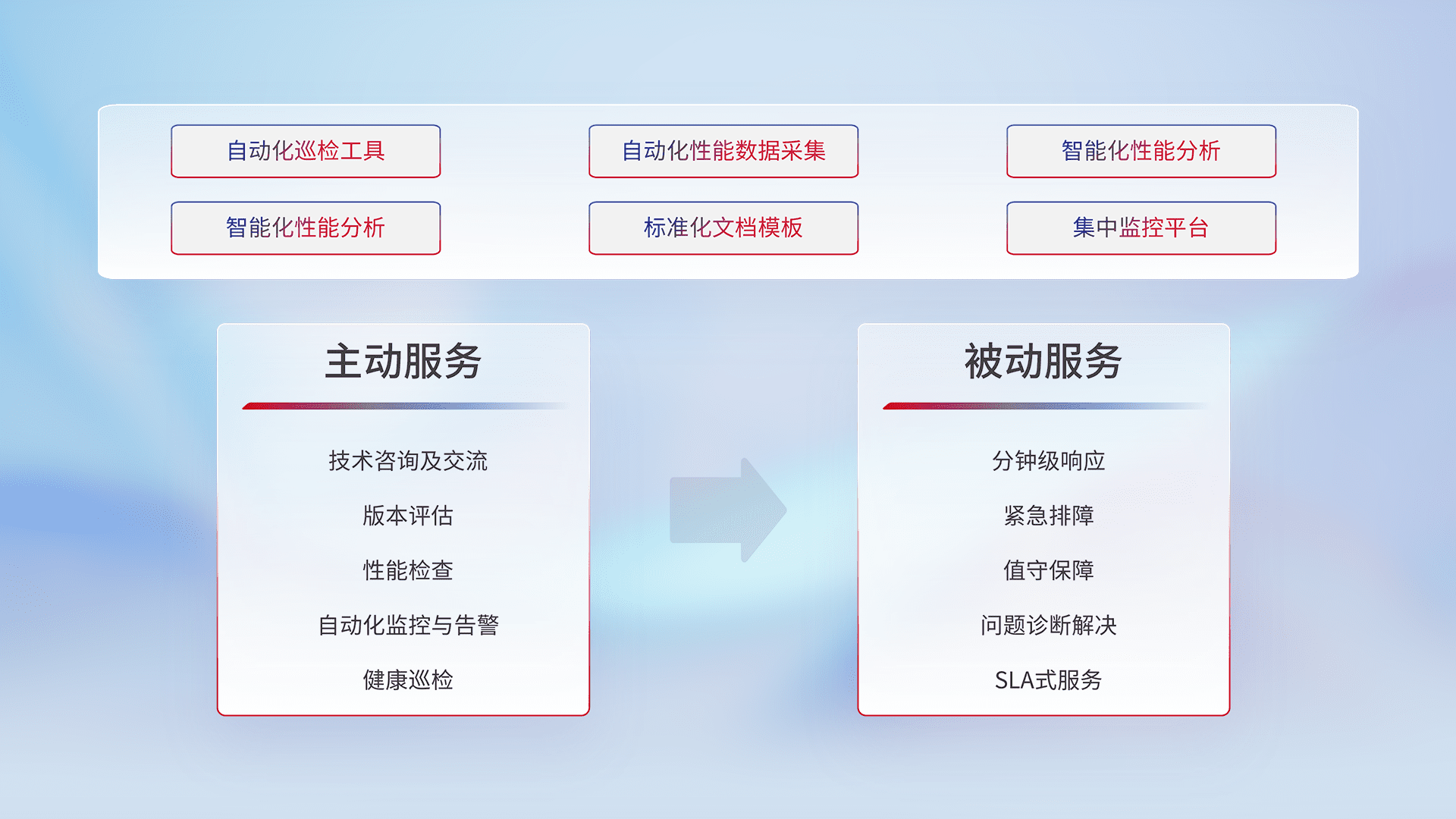 智能化工具和标准化文档,,,,保障服务质量,,,,提供主动服务(包含技术咨询、、版本评估、、、、性能检查、、、、自动化监控与告警、、、健康巡检)和被动服务包含(分钟级响应、、、、紧急排障、、值守保障、、问题诊断解决、、、、SLA服务)。。。。