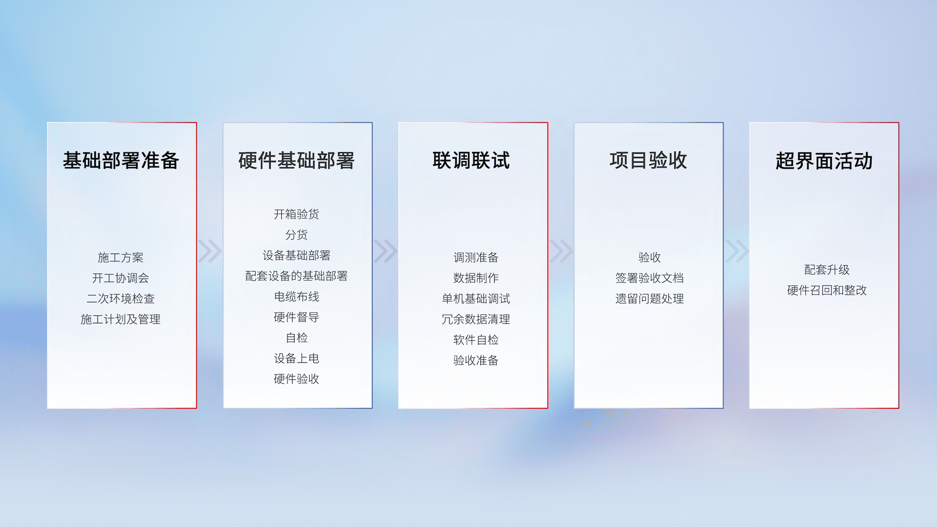 从基础部署准备、、硬件基础部署、、、联调联试、、项目验收、、、、越界面活动的全过程可追溯,,,保证施工质量和进度。。。。